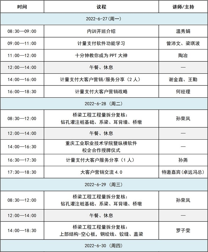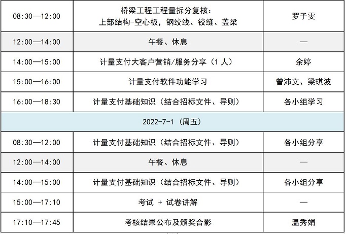 本次内训共计26人参加,为期一周的内训以《纵横计量支付结算决算一体化软件》为中心开展,从软件功能实操学习、到工程量拆分复核,期间还多次穿插计量支付营销战略、服务心得分享。看看咱们满满当当的课表,就知道纵横人对于“纵横云计量,管好项目每一分钱”的专业态度绝不是在空喊口号。